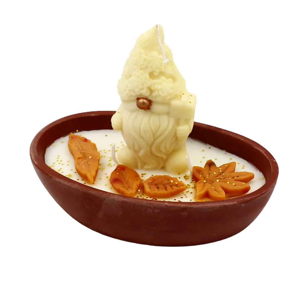 - Φθινοπωρινή/Γιορτινή Διακόσμηση: Γύρω από τον νάνο, η βάση του κεριού κοσμείται με μικρά, χειροποίητα κεριά σε σχήμα φύλλων (π.χ., σφένδαμος, βελανίδι) σε ζεστές αποχρώσεις του πορτοκαλί-καφέ, παραπέμποντας στα πλούσια χρώματα του φθινοπώρου ή τις χριστουγεννιάτικες διακοσμήσεις.
