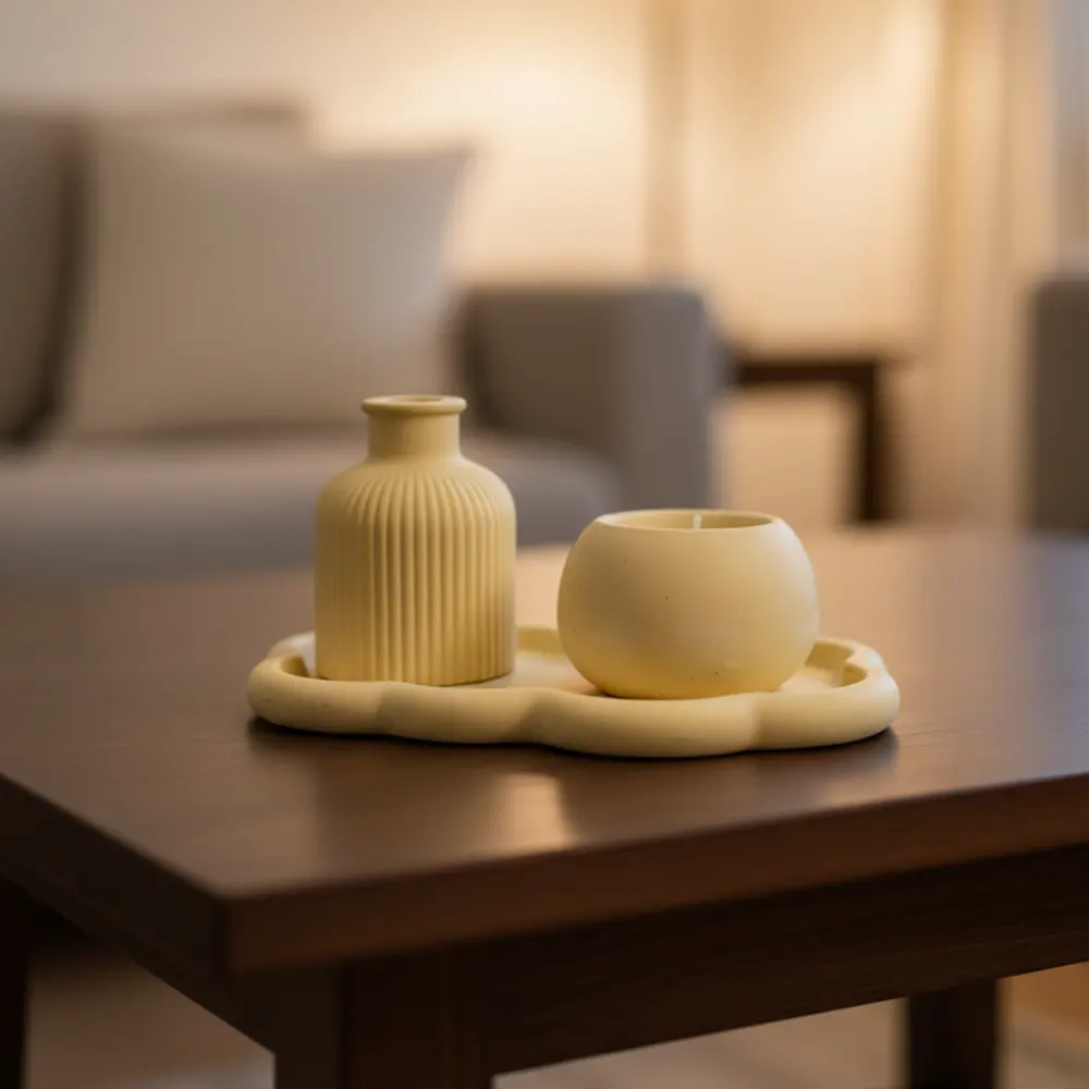 Γλυκό και παιχνιδιάρικο σετ αρωματικού κεριού και διακοσμητικού βάζου από πορσελάνη, σε απαλή κίτρινη απόχρωση, θα προσθέσει μια νότα χαράς και φρεσκάδας σε κάθε γωνιά του σπιτιού σας.