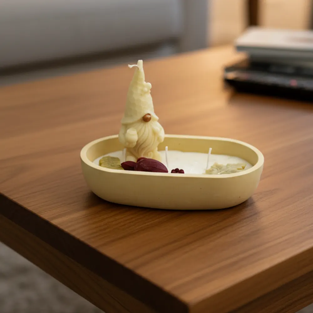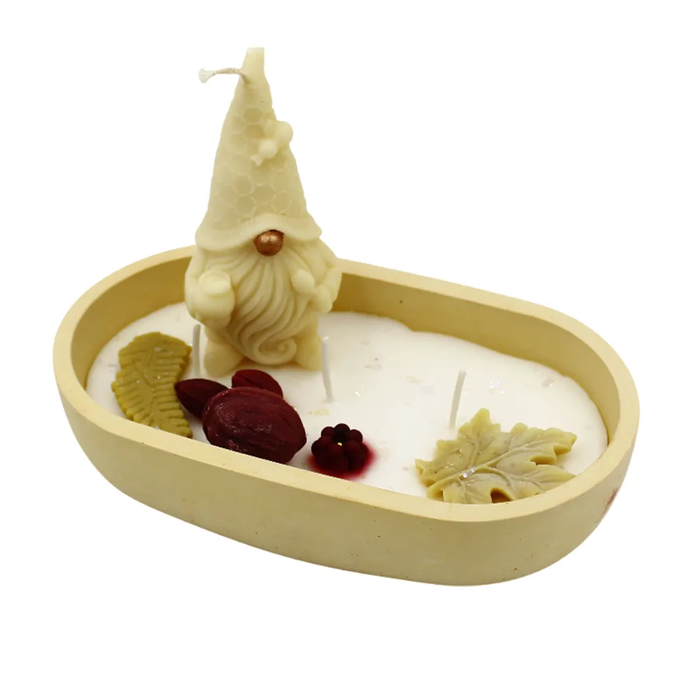 - Σχεδιασμός: Ένα γοητευτικό οβάλ κερί που φιλοξενεί μια αξιολάτρευτη φιγούρα νεράιδας (ή νάνου/gnome) με μυτερό καπέλο, σε απαλό κρεμ χρώμα. Το κερί είναι διακοσμημένο με φύλλα σε πράσινες και μπορντό αποχρώσεις, καθώς και μικρές κόκκινες λεπτομέρειες, προσδίδοντας μια φθινοπωρινή και παραμυθένια αίσθηση.